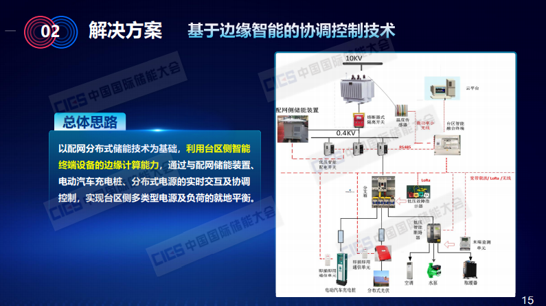 下面,介紹第二個(gè)關(guān)鍵技術(shù),基于邊緣智能的協(xié)調(diào)控制技術(shù)??傮w思路如下,我們以配網(wǎng)分布式儲(chǔ)能技術(shù)為基礎(chǔ),利用臺(tái)區(qū)側(cè)智能終端設(shè)備的邊緣計(jì)算能力,通過與配網(wǎng)儲(chǔ)能裝置、電動(dòng)汽車充電樁、分布式電源的實(shí)時(shí)交互及協(xié)調(diào)控制,實(shí)現(xiàn)臺(tái)區(qū)側(cè)多類型電源及負(fù)荷的就地平衡。同時(shí),按照國網(wǎng)公司云、管、邊、端的配電物聯(lián)網(wǎng)總體架構(gòu),臺(tái)區(qū)智能終端將數(shù)據(jù)進(jìn)一步上送至省級(jí)配電信息主站及配電網(wǎng)數(shù)據(jù)共享中心,通過多個(gè)終端與云主站的“云邊協(xié)同”,還可以進(jìn)一步實(shí)現(xiàn)區(qū)域級(jí)甚至網(wǎng)絡(luò)級(jí)的能源優(yōu)化及管理。以上是對于虛擬電廠的實(shí)現(xiàn)。