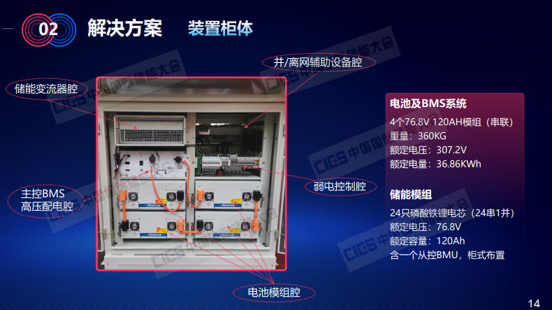 以我們?nèi)ツ觊_發(fā)出來的30kWh配置的裝置為例,我們看一下它的結(jié)構(gòu)。這是電池箱,電池是采用了4個(gè)76.8V/120Ah模組,重量是360千克,額定電壓是307.2V,實(shí)際額定電量是36.86KWh,每個(gè)儲(chǔ)能模組主要是由磷酸鐵鋰電芯以24串一并的方式構(gòu)成,含有一個(gè)從控BMU,是柜式布置。
