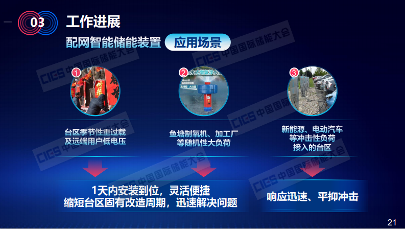 未來,當(dāng)我們裝置規(guī)模化應(yīng)用以后,可以在一定程度上補(bǔ)充電能缺口,還可以減少主網(wǎng)的投資,緩解線路的重過載問題。此外,儲(chǔ)能裝置還可以作為特殊時(shí)期的應(yīng)急保障電源,支撐局部線路,這是我們思考的一些額外裝置功能。在這里,這是目前儲(chǔ)能裝置涉及到的主要應(yīng)用領(lǐng)域,對于配網(wǎng)儲(chǔ)能裝置來說,非常適合應(yīng)用在季節(jié)性重過載以及遠(yuǎn)端用戶低電壓,還有魚塘制氧機(jī)、加工廠等隨機(jī)性大負(fù)荷所在區(qū)域,同時(shí)對新能源、電動(dòng)汽車等沖擊性負(fù)荷接入的臺(tái)區(qū),也可以迅速響應(yīng)。