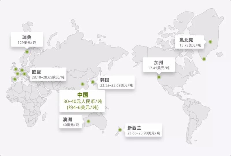 全球主要市場(chǎng)碳價(jià)格(數(shù)據(jù)來(lái)自于全球主要碳交易所)