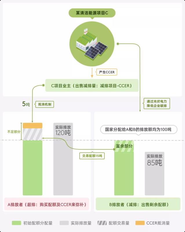 CCER是指由發(fā)改委審定,并在國(guó)家注冊(cè)登記系統(tǒng)中登記的溫室氣體自愿減排量,簡(jiǎn)稱CCER。CCER主要來(lái)自于通過(guò)清潔能源代替化石燃煤等所產(chǎn)生的減排量,CCER可與碳配額等量互換,控排企業(yè)可購(gòu)買(mǎi)CCER用于碳履約,滿足其控排要求。