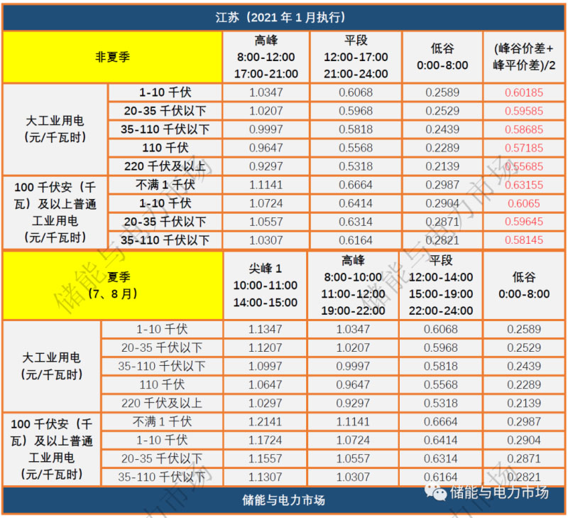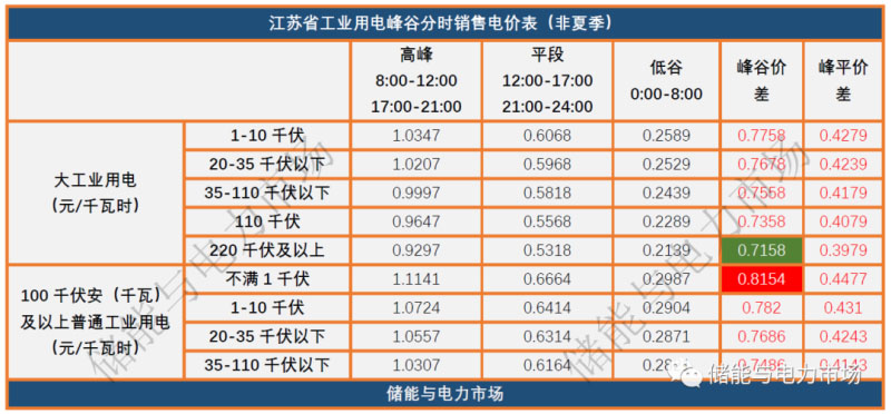 2020年11月3日,江蘇省發(fā)改委發(fā)布了《關(guān)于江蘇電網(wǎng)2020-2022年輸配電價和銷售電價有關(guān)事項的通知》。根據(jù)通知的內(nèi)容,江蘇省峰谷價差最大為0.8154,最低為0.7158(如下表)。