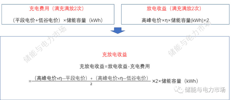假設(shè)每天兩充兩放,充放電效率為η,不考慮特殊情況下的尖峰電價,只考慮高峰、平段、低谷電價,充放電收益的計算可總結(jié)為下圖。