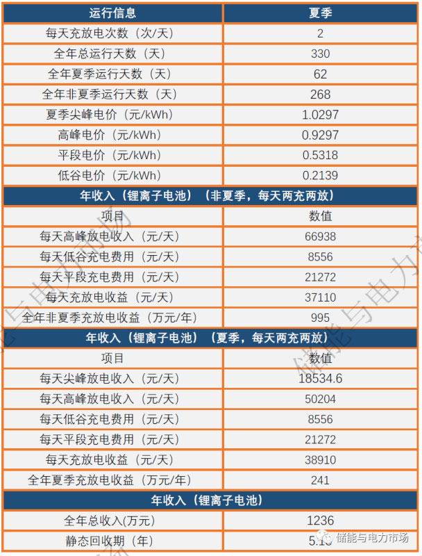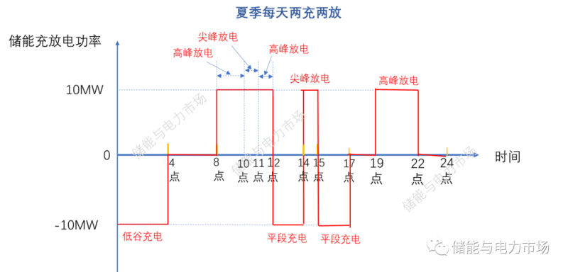 夏季,每天低谷0-4點,平段12-14點,15-17點充電,總共充電8小時,每天高峰8-10點、11-12點、19-22點,以及尖峰10-11點、14-15點放電,總計放電8小時。