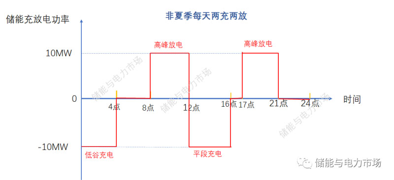 非夏季,每天低谷0-4點,平段12-16點各充電4小時,總計充電8小時。每天高峰8-12點,17-21點各放電4小時,總計放電8小時。