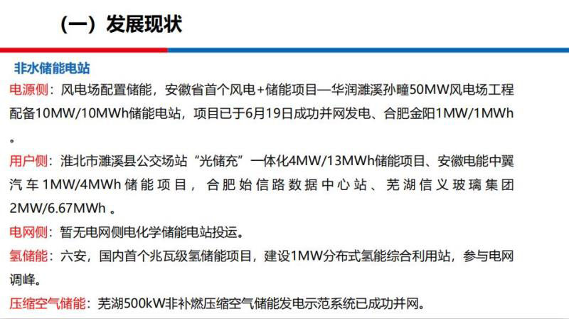 發(fā)展現(xiàn)狀和存在的問題,安徽實(shí)際上最重要的一個(gè)儲(chǔ)能形式是抽水蓄能,安徽的抽水蓄能建成的量、在建的量、規(guī)劃的量都是比較大的,加在一起是一個(gè)超過千萬級(jí)的綠色儲(chǔ)能基地。相對(duì)于抽水蓄能來講,安徽的化學(xué)儲(chǔ)能發(fā)展相對(duì)偏慢,當(dāng)然這主要是跟廣東、江蘇等發(fā)達(dá)地區(qū)來比。