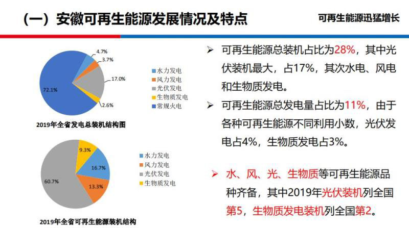 到2019年,在裝機(jī)結(jié)構(gòu)里面,可再生能源在安徽已經(jīng)達(dá)到28%,其中光伏最大,已經(jīng)達(dá)到17%,可再生能源總發(fā)電量達(dá)到11%,光伏裝機(jī)是全國第五,生物質(zhì)發(fā)電是全國第二。