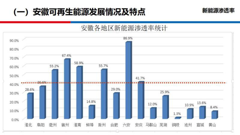 新能源在各地區(qū)的滲透率,往往決定了電網(wǎng)調(diào)節(jié)的壓力,典型的就是六安,新能源最大滲透率已經(jīng)超過80%。從滲透率可以估計(jì),安徽很多地市電網(wǎng)調(diào)節(jié)壓力可能比較大,本圖從左到右的地市基本上是安徽從北到南的地市分布,可以看得出來皖北、皖中的滲透率相對(duì)高。