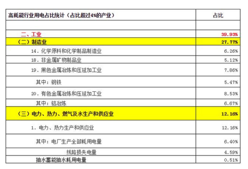用電量占比超過4%的工業(yè)行業(yè)如下表: