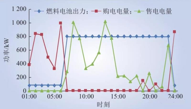 由圖3可知,在1:00~7:00和24:00~1:00間,由于燃料電池的發(fā)電成本高于電價水平,系統(tǒng)運行主要依靠配網(wǎng)的購電,燃料電池在約束條件下以其最小功率運行。其余時段燃料電池均以最大功率運行,與儲能單元、光伏電源一同將電供給負荷,減少微電網(wǎng)向配網(wǎng)的購電量,降低系統(tǒng)的運行成本。同時,在滿足內(nèi)部負荷且有富余電量的情況下,微電網(wǎng)在峰平電價時段(圖中的7:00~18:00,20:00~21:00,23:00~24:00)售以配網(wǎng),實現(xiàn)削谷填峰。