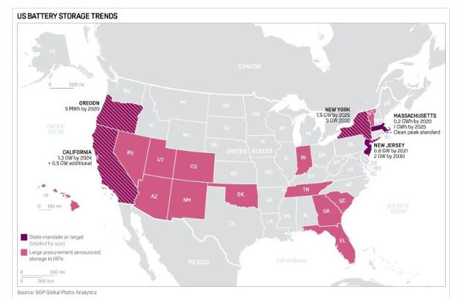 2018年,美國(guó)新澤西州、馬薩諸塞州、紐約州發(fā)布了對(duì)儲(chǔ)能部署的支持政策,而紐約州于2019年推出了針對(duì)各種規(guī)模儲(chǔ)能系統(tǒng)的2.8億美元財(cái)務(wù)激勵(lì)計(jì)劃。