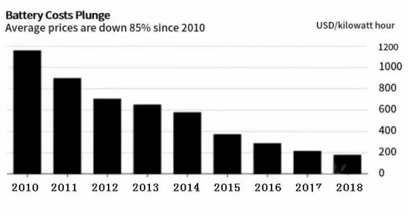 鋰離子電池價格自2010年到2018年的平均價格下降了85%