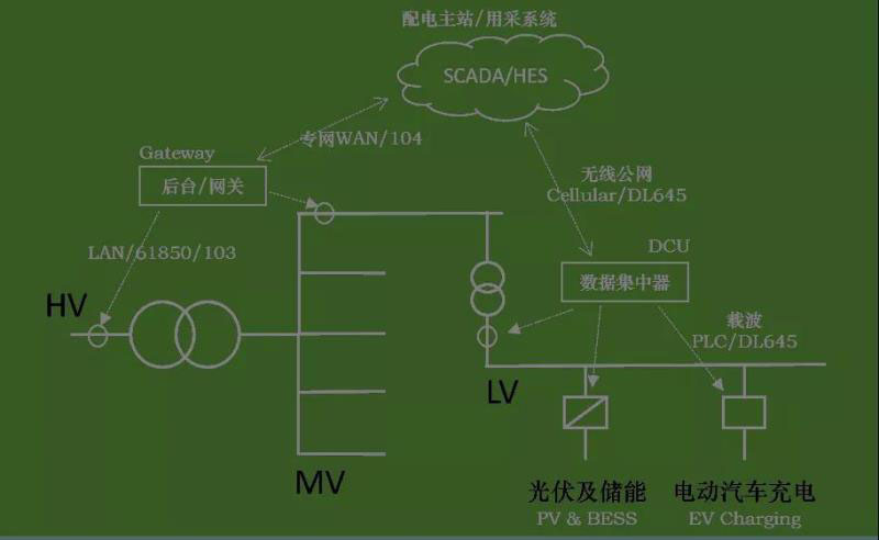 確定了具體的需求和應(yīng)用邏輯,在試點項目實施過程中,最重要的是確定通信方式和所使用的通信協(xié)議。由圖9,配電管理的高壓/中壓系統(tǒng)基本與變電站和大電網(wǎng)使用的通信方式/控制協(xié)議相一致。這些協(xié)議與用電信息采集使用的有很大的差別。本質(zhì)上公網(wǎng)無線和專網(wǎng)只是在安全防護設(shè)計上有所不同,但在使用控制協(xié)議上,配網(wǎng)和用采的協(xié)議有巨大區(qū)別。