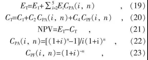 式中:E T 為儲能系統(tǒng)生命周期內(nèi)收益凈現(xiàn)值;C T為儲能系統(tǒng)生命周期內(nèi)成本凈現(xiàn)值;C PA(i, n)為年金現(xiàn)值系數(shù);C PF(i, n)為一次支付現(xiàn)值系數(shù)。