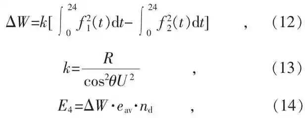 式中:ΔW 為2 條負荷曲線在一天內(nèi)的有功損耗之差;R 為用戶變壓器和用戶配電網(wǎng)絡電阻之和;cosθ 為負荷功率因數(shù);U 為負荷母線電壓;f1(t)為無儲能系統(tǒng)時, 用戶負荷曲線在t 時刻負荷值;f2(t)為建設(shè)儲能系統(tǒng)后, 用戶負荷曲線在t時刻負荷值;E4 為年降損收益;e av 為峰谷電價平均值。