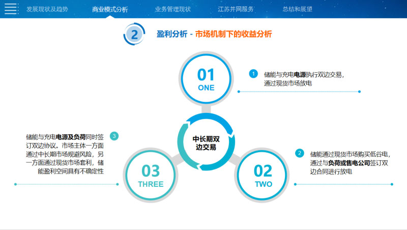 前面講的是執(zhí)行目前電價(jià)上的收益,后面講一下市場(chǎng)機(jī)制下的收益分析。目前國內(nèi)還是試點(diǎn),還沒有大范圍推廣,所以這個(gè)可以說是未來幾年或者說未來發(fā)展的一個(gè)趨勢(shì)。我國目前只有部分省份開展了試點(diǎn),甘肅、陜西已經(jīng)開展了電力現(xiàn)貨市場(chǎng),2018年中長期交易電量達(dá)到27%。按照《全國統(tǒng)一電力市場(chǎng)深化設(shè)計(jì)方案》,2025年以后我國將全面實(shí)施電力市場(chǎng),到那個(gè)時(shí)候我們就存在省和省之間以及省內(nèi)的兩級(jí)電力現(xiàn)貨市場(chǎng)模式,大部分普通工業(yè)和大工業(yè)用戶自己的儲(chǔ)能電站可以直接或者間接的參與電力市場(chǎng)。