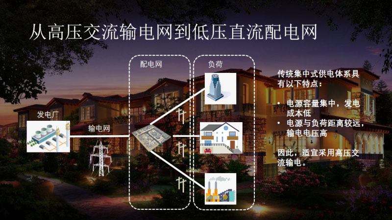 今天匯報(bào)的主題是《基于用戶側(cè)儲能的家庭低壓直流網(wǎng)》。匯報(bào)包括四部分,第一部分我們將從交流到直流的演進(jìn)講起,匯報(bào)直流在配電領(lǐng)域未來的優(yōu)勢,第二部分將向大家匯報(bào)家庭直流網(wǎng)中電壓選擇、布網(wǎng)和控制,第三部分是包含儲能系統(tǒng)的家庭直流網(wǎng)中能量傳遞,最后一部分我給大家簡要介紹一下同里項(xiàng)目的概況。