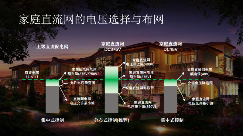 這是對三級電網(wǎng)建議的電壓的選擇,對于最外層的上級直流配電網(wǎng)選擇375或者750是一個(gè)定電壓控制,是集中式的控制,所以它有一個(gè)較小的允許電壓降范圍,通常是以額定功率和線路阻抗來設(shè)計(jì)的,我們目前設(shè)計(jì)的是1.4%的電壓下降。中間這一級是375家庭直流網(wǎng),與上級的直流配電網(wǎng)連接。為什么這里用一個(gè)帶有電壓帶的方式呢?是因?yàn)樵谶@一級家庭直流網(wǎng)中我們通常會接入大量的光伏、儲能,所以它不再適用于集中式的控制,會選擇分布式的控制,我們會為它預(yù)留一些下垂控制的范圍,我們把它叫做電壓帶,它的電壓帶上限是400V,下限350V。