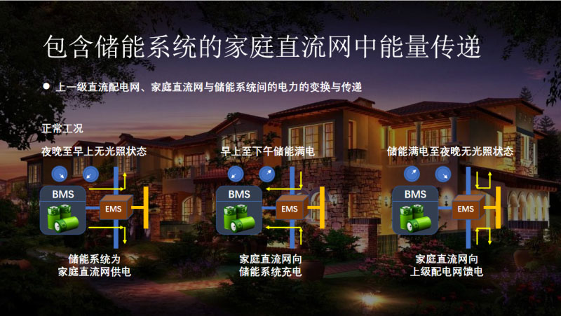 這里是我們儲能正常工況下的三個(gè)典型工況,在夜晚至早上無光的狀態(tài),儲能釋放電能,為375家庭直流網(wǎng)供電。在早上至下午儲能儲滿電的過程中,家庭直流網(wǎng)中的屋頂光伏會為儲能充電,在儲能充滿電的情況下屋頂光伏會向電網(wǎng)饋電。上級電網(wǎng)會替代儲能為整個(gè)家庭直流網(wǎng)供電,在上級配電網(wǎng)供電中斷的時(shí)候,儲能系統(tǒng)會為家庭直流網(wǎng)支撐電壓。儲能參與調(diào)壓的時(shí)候,家庭直流網(wǎng)向上級電網(wǎng)饋電。