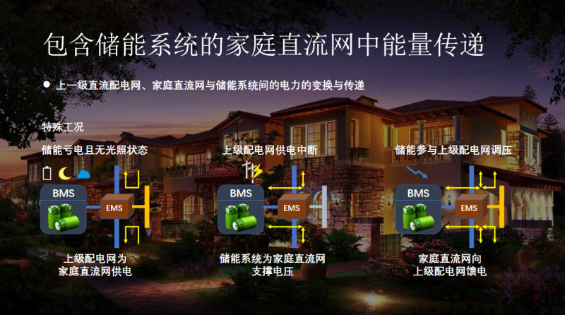 這里選擇400V的原因是因?yàn)樗枰獫M足國際電氣聯(lián)盟的標(biāo)準(zhǔn),因?yàn)樵谶@個(gè)標(biāo)準(zhǔn)里面規(guī)定所有的家用電器的電壓帶需要范圍是在400V以下。在家庭直流網(wǎng)中由于成本的要求,構(gòu)建一個(gè)獨(dú)立的能量管理和協(xié)同控制系統(tǒng)是并不合適的,像同里綜合能源中心那種大型的直流網(wǎng)中會有獨(dú)立的協(xié)控系統(tǒng)還有能量管理系統(tǒng),對于更次一級的家庭納網(wǎng)這種架構(gòu)是不太適用的,它需要一個(gè)更低成本、更簡化的架構(gòu)方式。而儲能自身的EMS系統(tǒng)就特別適合作為這么一個(gè)中心控制器,因?yàn)樗挠布强梢詽M足這些需求的。