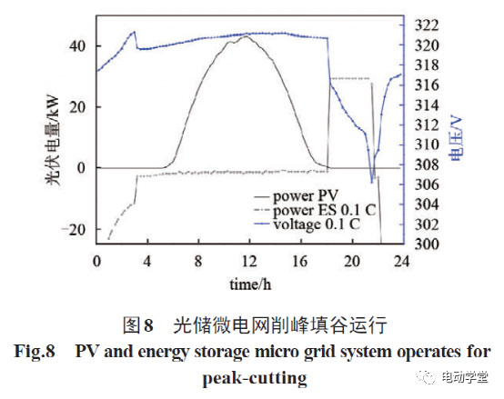 將篩選并成組后的退役動(dòng)力鋰電池應(yīng)用于光儲(chǔ)微電網(wǎng)系統(tǒng)中,設(shè)置電池放電倍率為0.1C,充電倍率為0.05C,并依據(jù)當(dāng)?shù)胤骞入妰r(jià)時(shí)段進(jìn)行充放電,實(shí)現(xiàn)削峰填谷,運(yùn)行結(jié)果如圖8所示。
