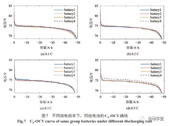 在不同倍率下對(duì)電池組進(jìn)行多個(gè)循環(huán)周期的恒功率充放電,利用電池管理系統(tǒng)記錄每組中各個(gè)電池包的放電容量及電壓值,得到電池的CD-OCV曲線,根據(jù)曲線的離散情況對(duì)電池成組配組情況進(jìn)行驗(yàn)證。