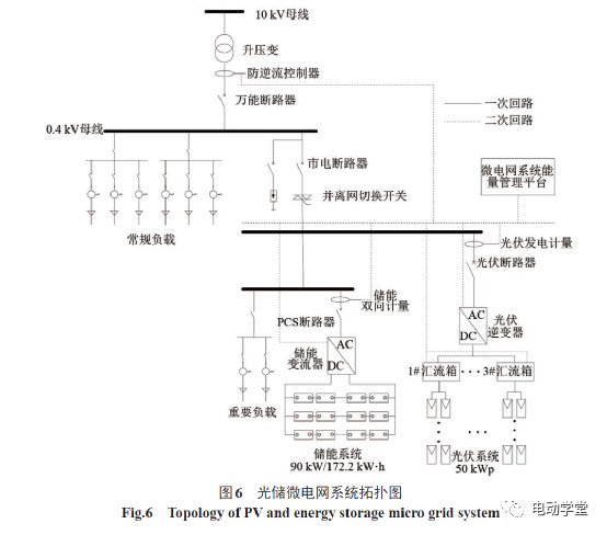 將90kW/172.8kW·h儲(chǔ)能系統(tǒng)同50kWp分布式光伏系統(tǒng)在交流側(cè)并聯(lián),并通過快速并離網(wǎng)切換開關(guān)接入到廠區(qū)0.4kV交流母線上,構(gòu)成光儲(chǔ)微網(wǎng)系統(tǒng)。其中,分布式光伏系統(tǒng)采用單晶硅組件,串聯(lián)后經(jīng)過直流匯流箱接入到組串式光伏逆變器中,與儲(chǔ)能系統(tǒng)在交流側(cè)耦合。儲(chǔ)能變流器的交流輸出端同時(shí)關(guān)聯(lián)部分重要負(fù)載,在市電異常時(shí),由光儲(chǔ)系統(tǒng)保障重要負(fù)載的供電。光儲(chǔ)系統(tǒng)拓?fù)鋱D如圖6所示。