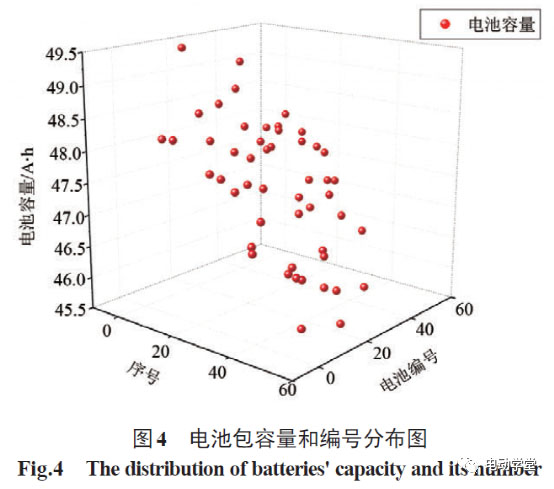 退役動(dòng)力電池包容量極差小于額定容量的10%,認(rèn)為這部分電池包具有較好的一致性。二次篩選后的50個(gè)電池包容量最大值為49.46A·h,容量最小值為45.58A·h,極差值為3.88A·h,占額定容量的6.5%,表征該50個(gè)電池包具有較好的一致性。將電池包按照容量大小進(jìn)行排序,根據(jù)電池容量的分布情況,選擇容量最接近的36個(gè)電池包進(jìn)行成組,剩余14個(gè)電池包留著備用。電池包的編號(hào)和容量分布如圖4所示。