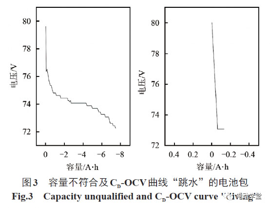 對(duì)剩下的電池包進(jìn)行一次充放電??紤]到電池為退役電池,設(shè)置充電電流為0.3C,放電電流為1C,充電截止電壓87.6V(單體3.65V),放電截止電壓70V(單體2.9V)。放電結(jié)束后,得到電池包的容量和CD-OCV曲線,判定電池放電容量在額定容量的75%以上,CD-OCV曲線未出現(xiàn)“跳水”現(xiàn)象的電池包合格,可以進(jìn)入梯次利用環(huán)節(jié)。經(jīng)測(cè)試后,72個(gè)電池包有22個(gè)電池包存在容量不合格及CD-OCV曲線異常的情況,剩下50個(gè)電池包符合要求。電池包二次篩選不合格情況如圖3所示。