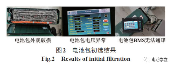 從電池包的外觀、銘牌、開路電壓、BMS通訊等方面對(duì)電池包進(jìn)行初選,對(duì)外觀有缺陷、銘牌信息缺失、開路電壓超出額定充電截止電壓的80%~110%范圍、BMS無(wú)法正常通訊的電池包予以剔除。經(jīng)檢測(cè),在80個(gè)電池包當(dāng)中存在3個(gè)電池包外觀有破損,4個(gè)電池包開路電壓超出額定充電截止電壓的80%~110%,1個(gè)電池包BMS無(wú)法通訊的情況,沒有通過初選,剩下72個(gè)電池包進(jìn)入到二次篩選環(huán)節(jié)。電池包初選不合格情況如圖2所示。