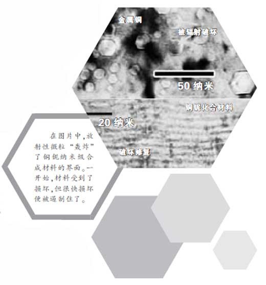 在納米級(jí)的合成材料中,上述“空缺”與“間隙”能在界面被同時(shí)捕獲,并極可能相遇。如果二者相遇,“間隙”中多余的原子就能重新填入“空缺”中,從而使被破壞的晶格結(jié)構(gòu)得到恢復(fù)。據(jù)邁克爾稱,修復(fù)完成之后,合成材料就能完全恢復(fù)以前的屬性,看起來像沒有受到輻射一樣。