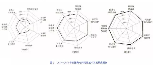 從技術(shù)上看,至2020年微網(wǎng)關(guān)鍵技術(shù)能夠基本支撐分布式可再生能源大規(guī)模推廣,至2030年微網(wǎng)技術(shù)能夠基本成熟,走向商業(yè)化,具體各技術(shù)方面發(fā)展預(yù)測(cè)如圖2所示。