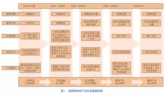 從樂觀角度看,未來20年將是微網(wǎng)產(chǎn)業(yè)政策完善階段,也是市場(chǎng)化蓬勃發(fā)展的階段。微網(wǎng)發(fā)展大幅向企業(yè)及獨(dú)立經(jīng)營(yíng)型轉(zhuǎn)變的階段,且不需要政府補(bǔ)貼,市場(chǎng)相對(duì)開放,競(jìng)價(jià)策略將會(huì)大幅推廣。對(duì)微網(wǎng)產(chǎn)業(yè)化發(fā)展路線詳細(xì)預(yù)測(cè)如圖3和圖4所示。