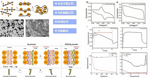 近期,中科院蘇州納米所陳韋研究員課題組設計制備了石墨烯包裹銀納米顆粒的電極,并成功獲得電化學穩(wěn)定的新型離子聚合物復合電驅(qū)動器件。傳統(tǒng)銀材料盡管具有良好的導電性,也是自然界相對豐富的材料資源,但由于其電化學充放電過程中redox反應,很難作為穩(wěn)定的電化學電極材料應用。而石墨烯和碳納米管材料具有較為惰性的電化學性質(zhì),在電化學充放電過程中具有高度的可逆特性。因此,為了既能利用銀的高電導,同時又避免發(fā)生電化學侵蝕,課題組設計制備了二維石墨烯包裹的Ag納米顆粒電極材料。研究結(jié)果如下圖顯示,納米銀復合電極在電化學充放電過程中由于石墨烯表面包覆,從而與電解質(zhì)之間隔絕形成穩(wěn)定的雙電層電容,有效地利用了銀的高度導電特性,實現(xiàn)了石墨烯包裹Ag納米顆??筊edox電極的寬頻(0.01-10Hz)大位移穩(wěn)定電化學驅(qū)動特性。相關成果已在Adv. Mater. ( DOI: 10.1002/adma.201203655)上在線發(fā)表。