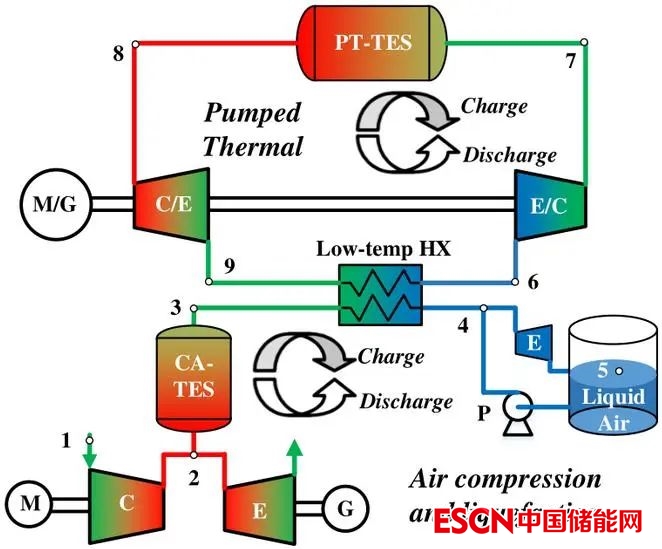 釋能時,熱泵儲電系統(tǒng)消耗熱能與冷能發(fā)電,而液態(tài)空氣儲能系統(tǒng)可以從液態(tài)空氣的氣化中實現(xiàn)冷能再生。