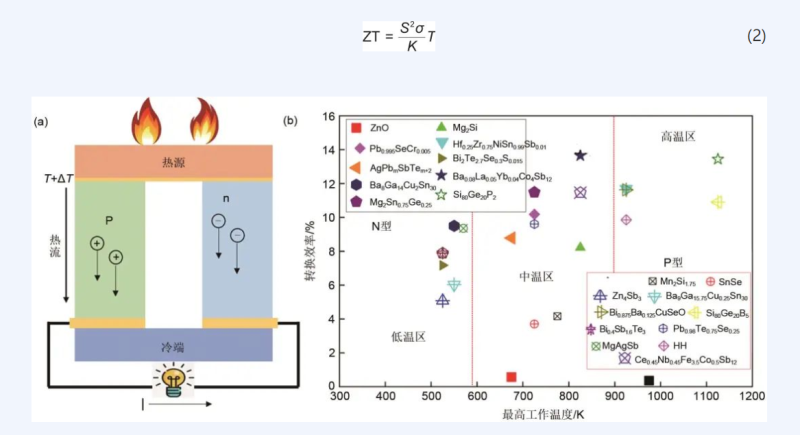 熱電器件通常是由多對串聯(lián)的n型及p型半導(dǎo)體熱電材料而組成,如圖3(a)所示。在半導(dǎo)體熱電材料的工作過程中,由于外界溫度梯度的存在,載流子(n型材料中的電子及p型材料中的空穴)在熱電勢的驅(qū)動下由熱端向冷端定向漂移形成電流,驅(qū)動外接電路工作。從熱力學(xué)角度分析,熱電器件可以認(rèn)為是以電子作為能量載體的熱機,可以實現(xiàn)熱能向電能的直接轉(zhuǎn)換。熱電材料的性能通常用無量綱的熱電優(yōu)值(ZT)來衡量,它與材料的塞貝克系數(shù)(S)、電導(dǎo)率(σ)及熱導(dǎo)率(K)有關(guān),即