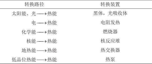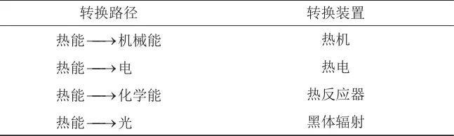 在實際的能源利用過程中,大量的能源首先轉(zhuǎn)換成熱能,熱能再通過熱機、熱電、熱反應(yīng)器、黑體輻射等方式轉(zhuǎn)變?yōu)闄C械能、電能、化學(xué)能和光能再加以利用,如表6所示。