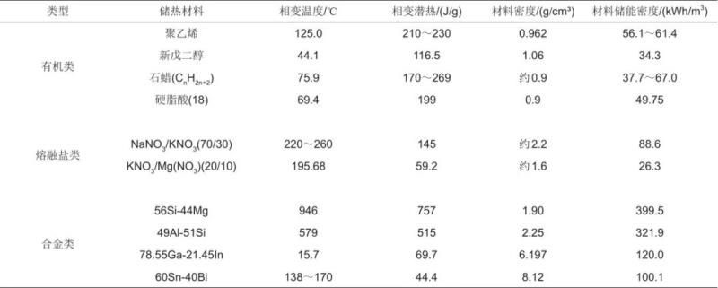 從材料的類型角度分,相變儲熱材料主要包括無機熔融鹽類、合金類、有機類以及復(fù)合類四種(表3)。熔融鹽類蓄熱材料潛熱密度大、安全性高、成本低,是目前在高溫場合廣泛應(yīng)用的儲熱材料。如在太陽能集熱發(fā)電領(lǐng)域常用的儲熱材料solar salt(30% KNO3+70% NaNO3)就是典型的熔融鹽類,此材料工作溫度為220~260 ℃,比熱容達到145 J/g,可以作為槽型拋物面太陽能電站的熱存儲材料。合金類相變蓄熱材料具有熔化熱高、儲熱密度大、導(dǎo)熱性能好、體積變化率小、使用壽命長等優(yōu)點,其儲熱性能比無機鹽和有機材料占有明顯的優(yōu)勢。但是該類材料密度高,在對材料重量較敏感的儲熱領(lǐng)域關(guān)注度不高,同時其含有Sn、Bi、Pb、Cd、In、Ga、Sb等貴金屬元素導(dǎo)致成本較高且具有毒性,限制了大規(guī)模應(yīng)用。典型的合金類相變蓄熱材料Pb-Sn合金相變儲熱材料的熔點為183 ℃,相變潛熱約104.2 J/g。