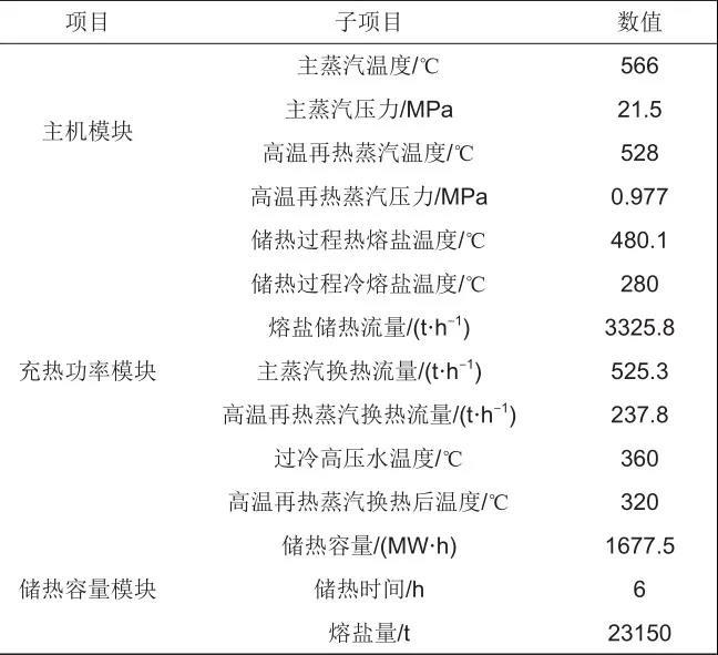 結(jié)合工程實(shí)際和前述理論分析,百兆瓦級熔鹽儲能技術(shù)選定技術(shù)參數(shù)見表1。儲熱容量指熔鹽儲能系統(tǒng)設(shè)計(jì)儲存熱量,由充熱功率和充熱時(shí)長決定。其中,充熱時(shí)長取火電機(jī)組供熱季常見的調(diào)峰時(shí)長6 h。充熱功率為主機(jī)模塊中鍋爐熱功率與汽輪機(jī)所需蒸汽熱功率差值,則本例充熱功率為279.6 MW。故熔鹽儲能系統(tǒng)設(shè)計(jì)儲熱量為1677.5 MW·h。