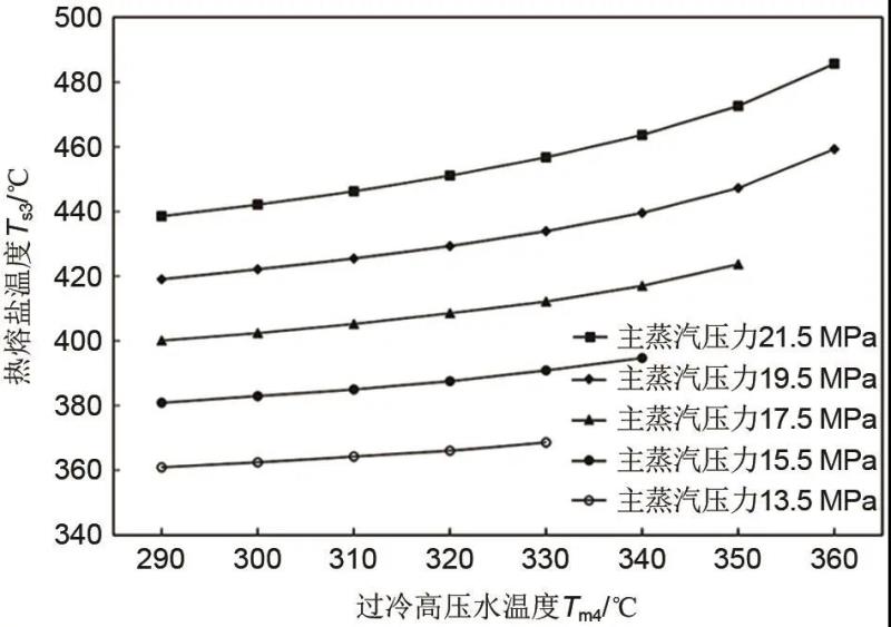 圖6 熱熔鹽溫度(Ts3)隨過冷高壓水溫度(Tm4)的變化關(guān)系