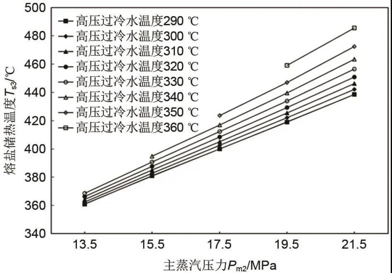 計(jì)算選取的主蒸汽壓力范圍是13.5 MPa≤p≤21.5 MPa,該壓力范圍對應(yīng)的蒸汽飽和溫度范圍是333.8~371.8 ℃,可保證主蒸汽冷凝放出大量熱被冷熔鹽(280 ℃)吸收。由圖3可知,隨著主蒸汽壓力(pm2)的增大,熔鹽儲熱過程熱熔鹽溫度(Ts3)也逐漸提高,且兩者近似呈線型關(guān)系。以過冷高壓水溫度(Tm4)290 ℃為例,兩者關(guān)系為