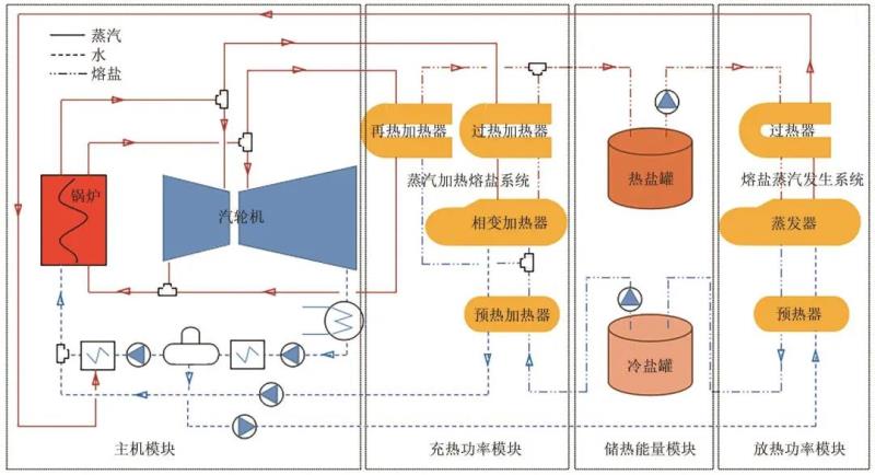熔鹽儲熱目前主要用于太陽能熱發(fā)電的大規(guī)模儲熱系統(tǒng)中,具有較好的經(jīng)濟(jì)性。范慶偉等提出基于儲熱過程的工業(yè)供汽機(jī)組熱電解耦方案,在火電機(jī)組正常運(yùn)行時(shí)抽取主蒸汽/高溫再熱蒸汽儲熱,在供汽高負(fù)荷時(shí)熔鹽放熱,實(shí)現(xiàn)熱電解耦。鹿院衛(wèi)等公開一種火電廠深度調(diào)峰裝置專利,分別抽取鍋爐主蒸汽、鍋爐高溫再熱蒸汽、汽輪機(jī)級間再熱蒸汽進(jìn)行儲熱,實(shí)現(xiàn)火電機(jī)組靈活調(diào)峰。時(shí)正海等公開一種鍋爐高溫?zé)煔馊埯}儲熱裝置及其工作方法專利,利用鍋爐高溫?zé)煔饧訜崛埯}儲熱,實(shí)現(xiàn)火電機(jī)組靈活調(diào)峰。當(dāng)前熔鹽儲熱技術(shù)受限于鍋爐再熱器超溫問題,只能在火電機(jī)組正常運(yùn)行時(shí)儲熱,不能在深度調(diào)峰低負(fù)荷工況下儲熱,調(diào)峰能力有限。