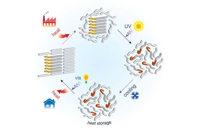 這種混合材料加熱即液化,但當(dāng)其暴露在紫外線下時(shí),即使再次冷卻下來(lái),也還能維持液態(tài)。這種材料的大部分熱能,都能以每克200焦耳的量存儲(chǔ)起來(lái),這在有機(jī)相變材料中,算儲(chǔ)存能力較強(qiáng)的。而當(dāng)其暴露在另一種光線下時(shí),就會(huì)固化,釋放熱能。