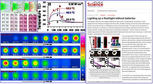 最后,以廢熱富集、高效轉(zhuǎn)換利用為導(dǎo)向,通過器件的系統(tǒng)集成,研制了基于廢熱發(fā)電的熱電轉(zhuǎn)換器件。利用石墨烯(Graphene)平面單層結(jié)構(gòu)便于電子快速傳輸從而提供良好的導(dǎo)熱性,綜合石墨烯良好的導(dǎo)熱性能和相變材料較高的相變潛熱,王振洋團(tuán)隊通過高溫蒸發(fā)和室溫下空氣中干燥的方法合成了一種新穎石墨烯和相變材料的復(fù)合材料,其中的石墨烯以三維網(wǎng)絡(luò)狀結(jié)構(gòu)被組裝在相變材料聚乙二醇(PEG)基質(zhì)中,為材料進(jìn)行快速熱傳導(dǎo)提供了良好的通路。另外,該團(tuán)隊首次證明G-PEGs的熱收集和存儲并為熱電設(shè)備提供熱源的能力。G-PEGs提供熱流通過熱電設(shè)備快速發(fā)電,可以點亮LED燈珠(Nanoscale, 2015, 7:10950;RSC Adv., 2017, 7:10683)。該工作并被“Atlas of Science”網(wǎng)站以“不用電池來點亮小手電”(“Lighting up a flashlight without batteries”)為題進(jìn)行了相關(guān)報道,引起了同行們關(guān)注(http://atlasofscience.org/lighting-up-a-flashlight/#more-3618)。