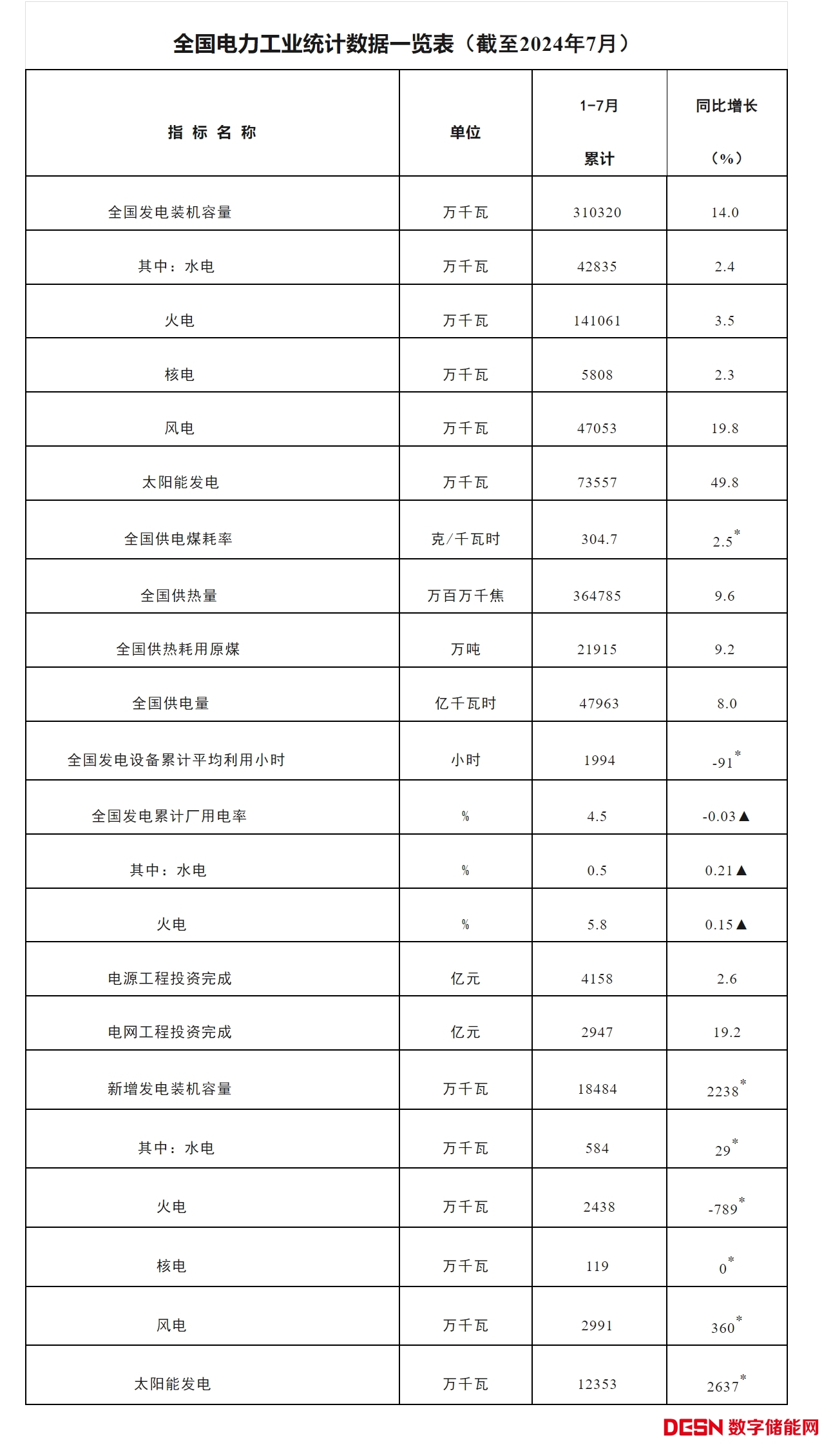 注:1.全國發(fā)電裝機容量及其中的分項指截至統(tǒng)計月的累計裝機容量。 2.全國供電量為調(diào)度口徑數(shù)據(jù)。 3.“同比增長”列中,標*的指標為絕對量;標▲的指標為百分點。