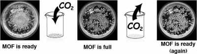 當(dāng)黃色的MOFs晶體內(nèi)充滿二氧化碳后,指示分子就會變成紅色。