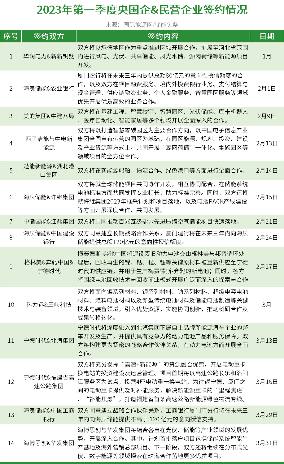 隨著儲能產(chǎn)業(yè)的高速發(fā)展,央國企+民企在儲能領(lǐng)域也開展了緊鑼密鼓的合作之中。據(jù)國際能源網(wǎng)/儲能頭條(微信號:chuneng365)統(tǒng)計,2023年第一季度龍頭民營與央國企共簽約14份合作協(xié)議。