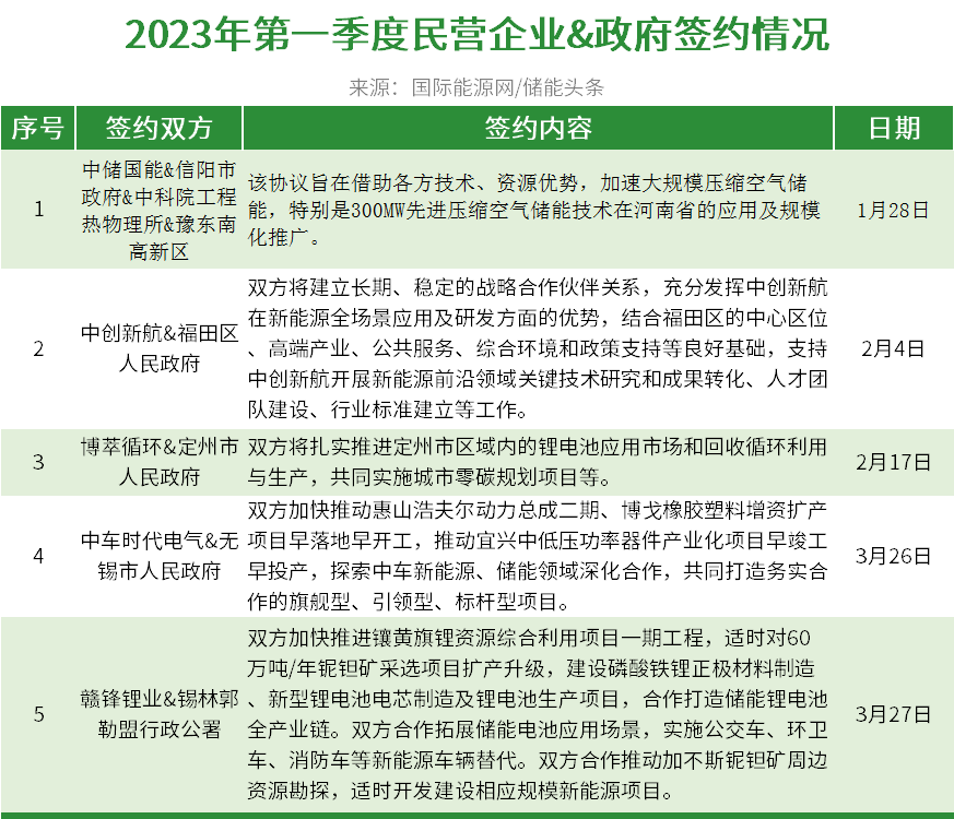 面對央國企的入局,中儲國能、中創(chuàng)新航、中車時代電氣、博萃循環(huán)、贛鋒鋰業(yè)等龍頭民營企業(yè)也與各地政府展開合作。據(jù)國際能源網(wǎng)/儲能頭條(微信號:chuneng365)統(tǒng)計,2023年第一季度龍頭民營與各地政府共簽約5份合作協(xié)議。