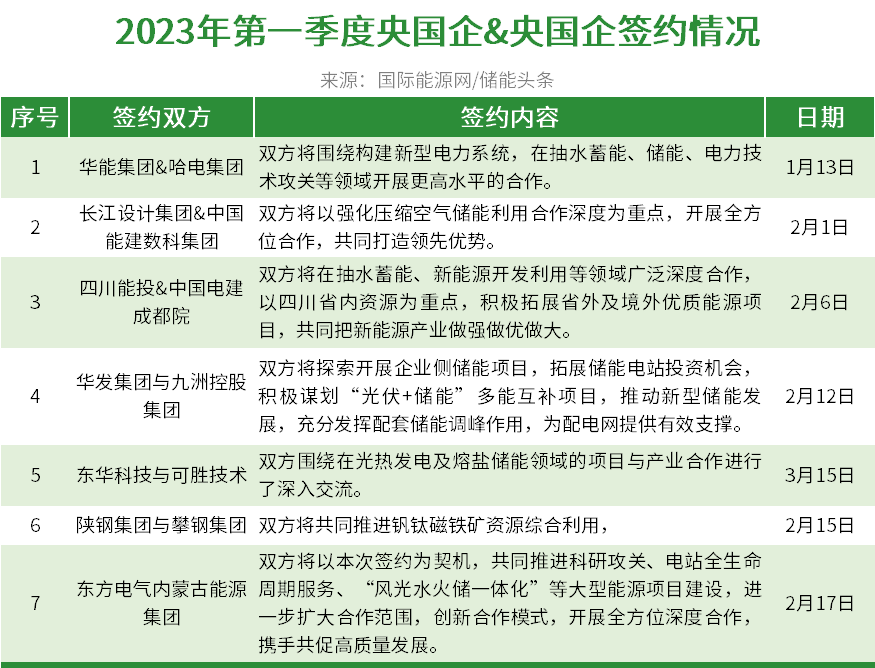 據(jù)國際能源網(wǎng)/儲能頭條(微信號:chuneng365)梳理,2023年第一季度央國企間在儲能領(lǐng)域簽約7份協(xié)議,其中華能集團、中國電建、中國能建、東方電氣作為電力行業(yè)先行軍,也加緊在儲能領(lǐng)域布局。