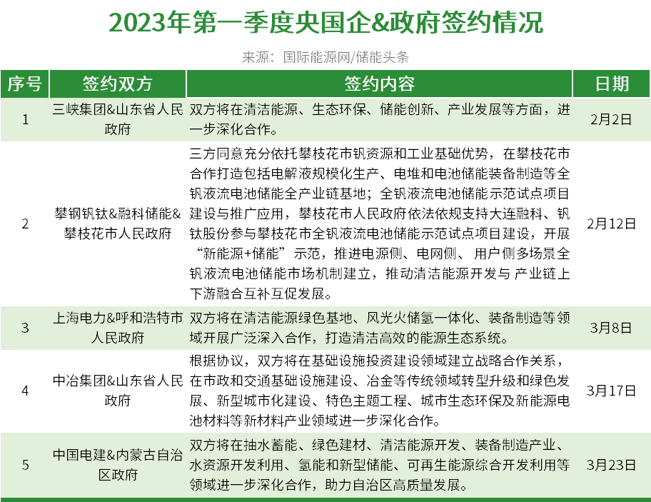 2023年第一季度央國企與各地政府共簽約5份合作協(xié)議,內(nèi)容涉及新型儲能、風光火儲氫一體化、新能源電池材料、釩液流電池儲能等方面。